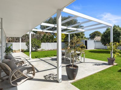 With ornamental grape vines growing over the back pergola, this will be a lovely spot to sit and relax throughout the year.