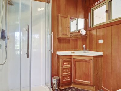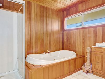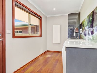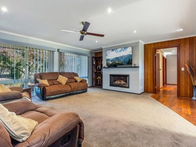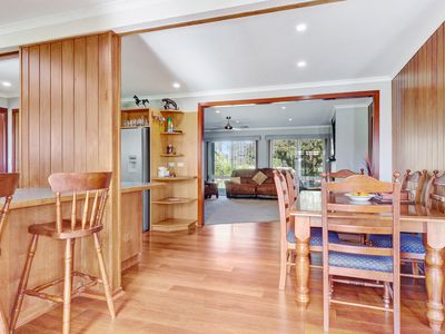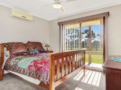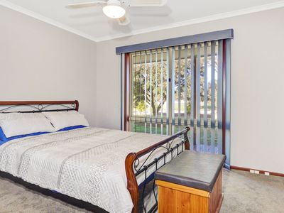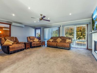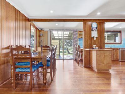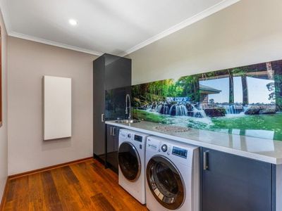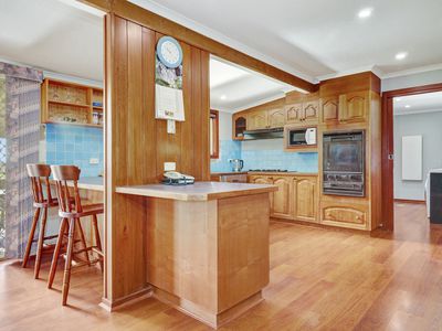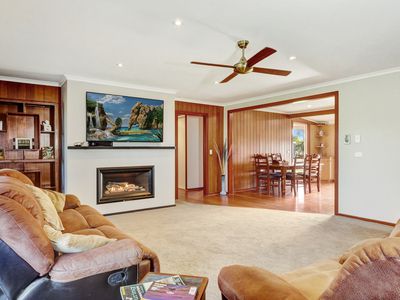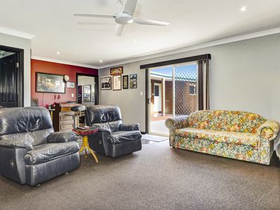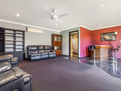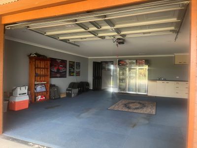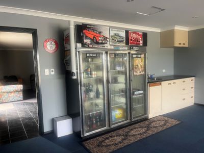 Adjoining the home is a carpeted two car garage with commercial fridge, bench and kitchen sink attached to a man cave with built in bar, big screen tv and bathroom with toilet and shower. This is perfect for entertaining, or a great separate space for guests.