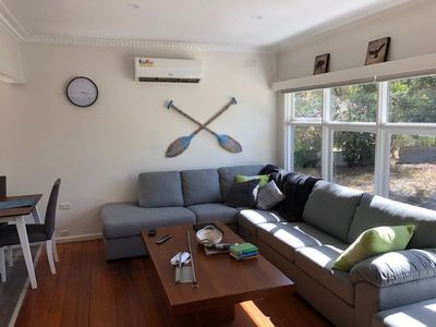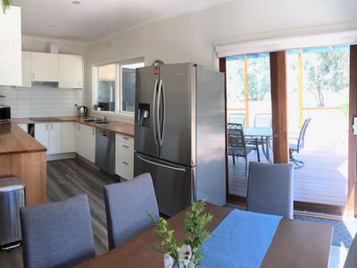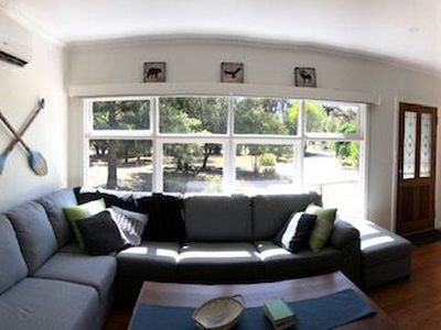 Featuring a central lounge area with split system, dining area opening onto a large decked under-roof entertainment area.