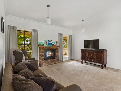 Spacious lounge enjoying cosy wood fire, and split system.