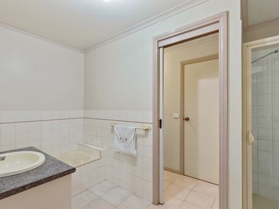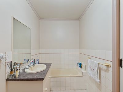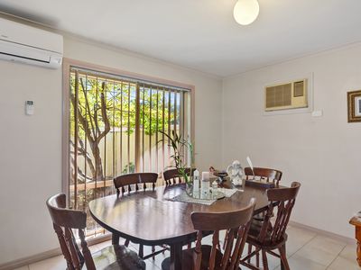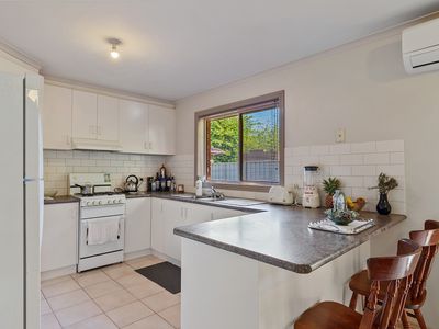 - Open plan kitchen and dining area offering split system and gas cooking.