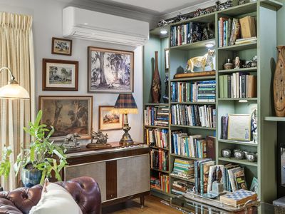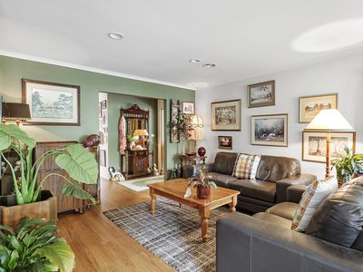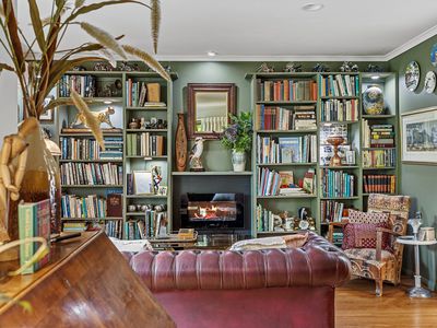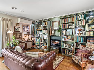 The light filled living space offering timber flooring, built in library, double glazed windows, split system, central gas heating and an electric fireplace making for the perfect winters night in.