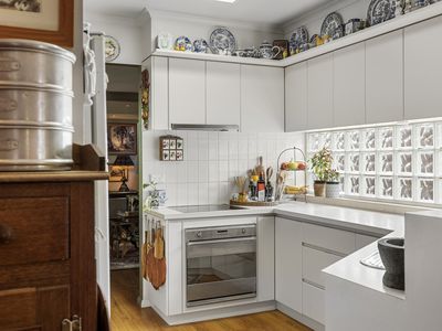 Modern kitchen offering electric oven and cook top, overhead cupboards along with a bench nook to store and hide your bulky electrical items.