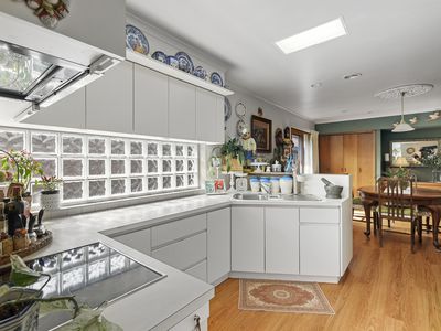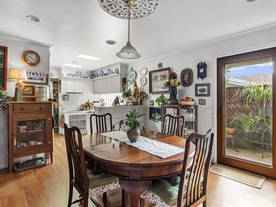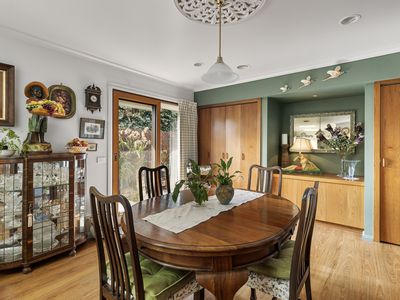 The large dining room or second living space offers built in cupboards along with a European laundry and built-in ironing board.