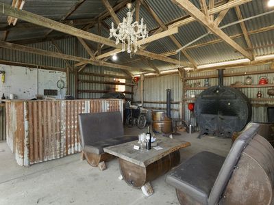 Shedding to the left of the home has an amazing entertaining area with seating, bar plus a wood heater the town will be envious of.