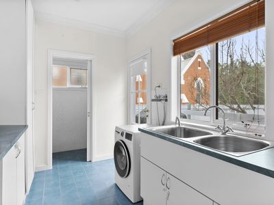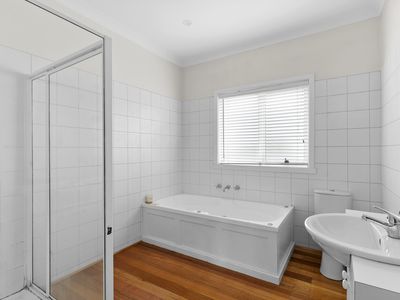 Main bathroom with bath and shower, with a second toilet and shower off the laundry.