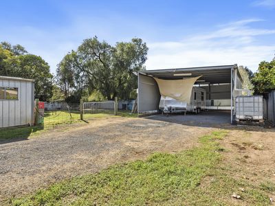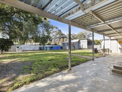 A fully fenced in backyard which not only has lockable shedding with concrete floor & power, 20" container, and a huge steel frame carport approx. 11m X 6m with a packed gravel floor and power supply giving you endless options for caravan/boat storage, it has loads of room for the kids to enjoy it all year round. Housing some beautiful trees around the fence line which will provide shade in those hot months. This is a very versatile block which has many options! Sitting out the back under the veranda will definitely be a spot well utilized.