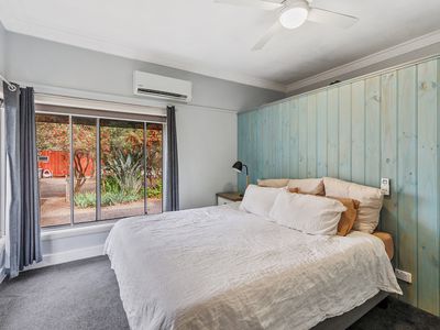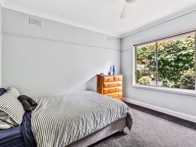 The master bedroom is a serene retreat, featuring a partitioned wall with a walk-in wardrobe, a ceiling fan, and an abundance of natural light. The additional bedrooms are spacious, each with lush carpeting, a ceiling fan, and one room also boasting built-in robes. These bedrooms are sure to impress with their size and comfort.