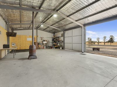The shed is equipped with a pot belly heater, adding a cozy and efficient heating option for the space, perfect for use during colder months. This, along with the other features such as concrete flooring, power, and water, makes the shed a practical and comfortable area for various uses, whether for storage, workshop, or leisure (STCA).
