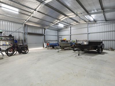 A huge shed, complete with concrete flooring, power, and multiple roller doors, provides ample storage or workspace.