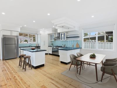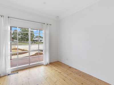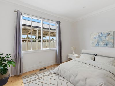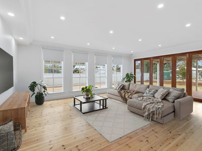 Lovingly brought back to its former glory, the home blends classic charm with modern comforts. At the heart of the property is a spacious, light-filled open-plan kitchen, meals, and living area, featuring stunning ornate timber windows and bifold timber doors that open seamlessly to a decked undercover entertaining area — perfect for year-round enjoyment.
