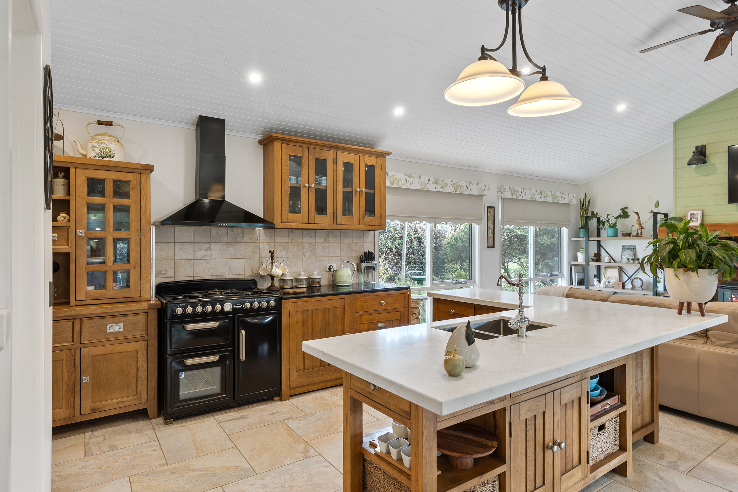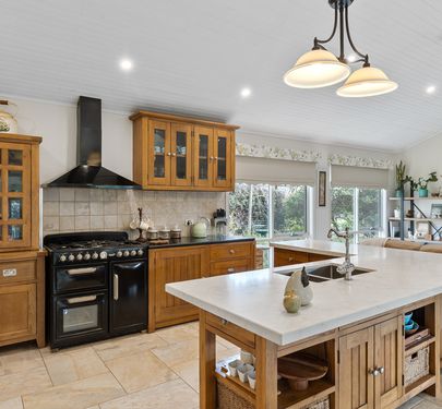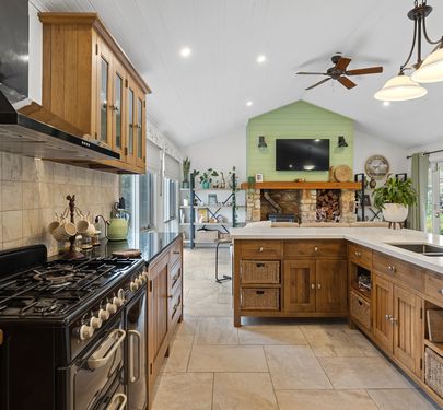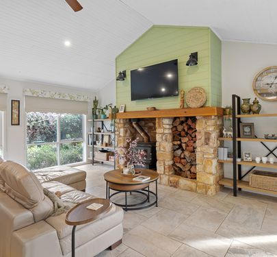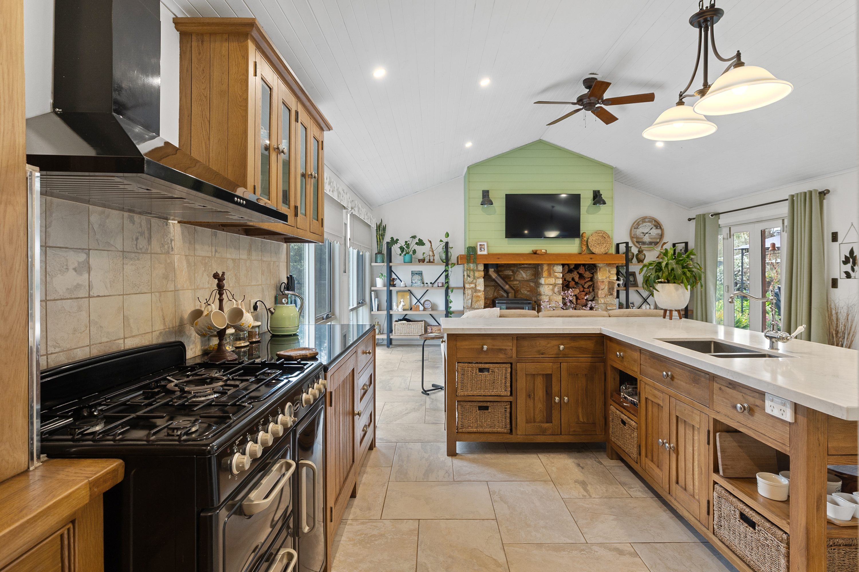 Step into warmth and charm with an open-plan country kitchen featuring a stone island bench, large gas cooktop, and walk-in pantry/butlers. The adjoining dining and family room boasts a stunning stone feature fireplace, soaring timber-lined cathedral ceilings, and French doors that open to the under-roof outdoor entertaining area.
