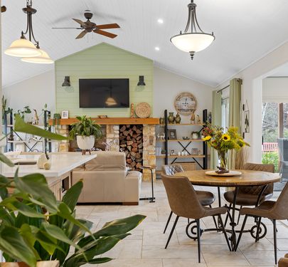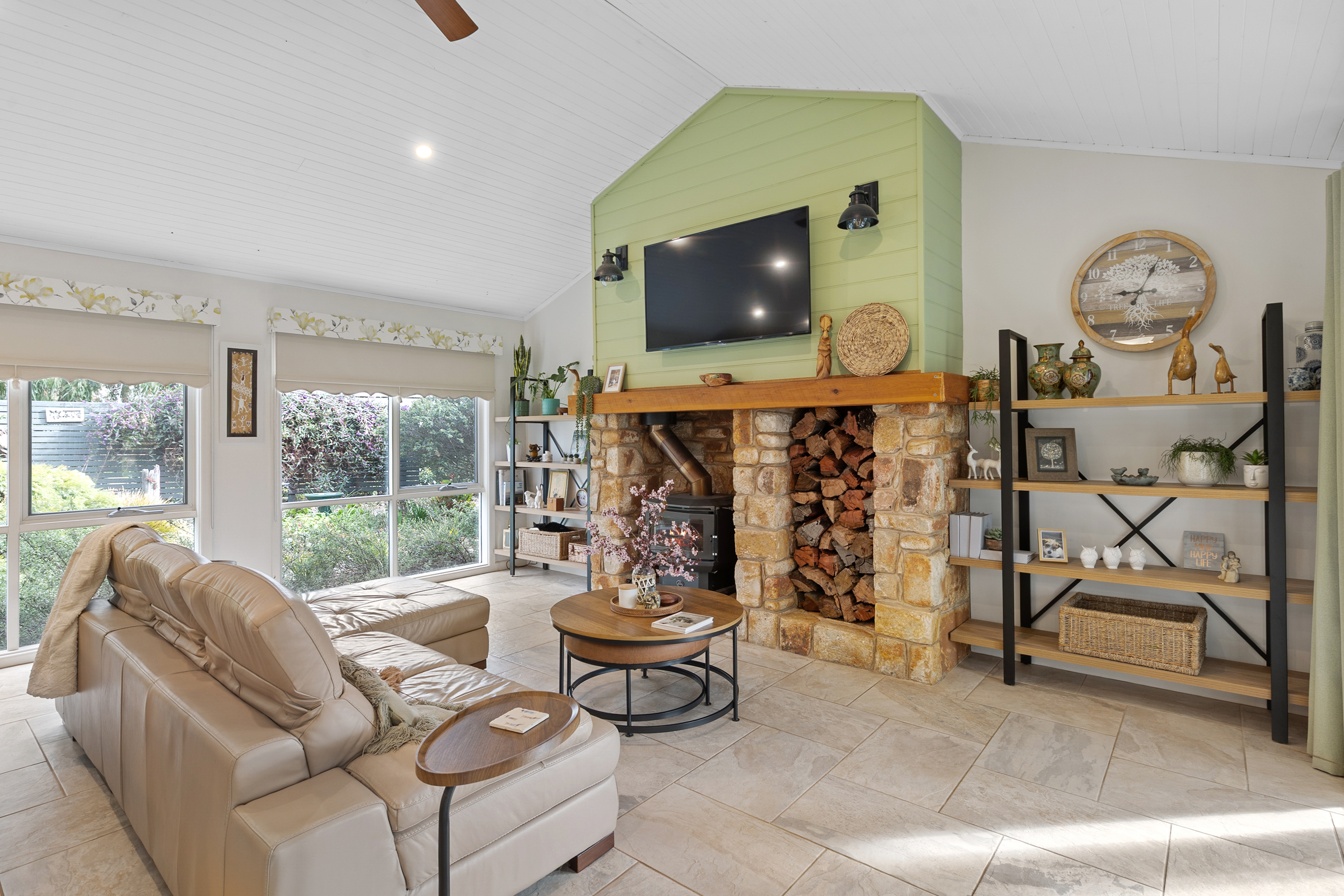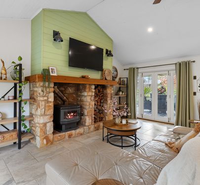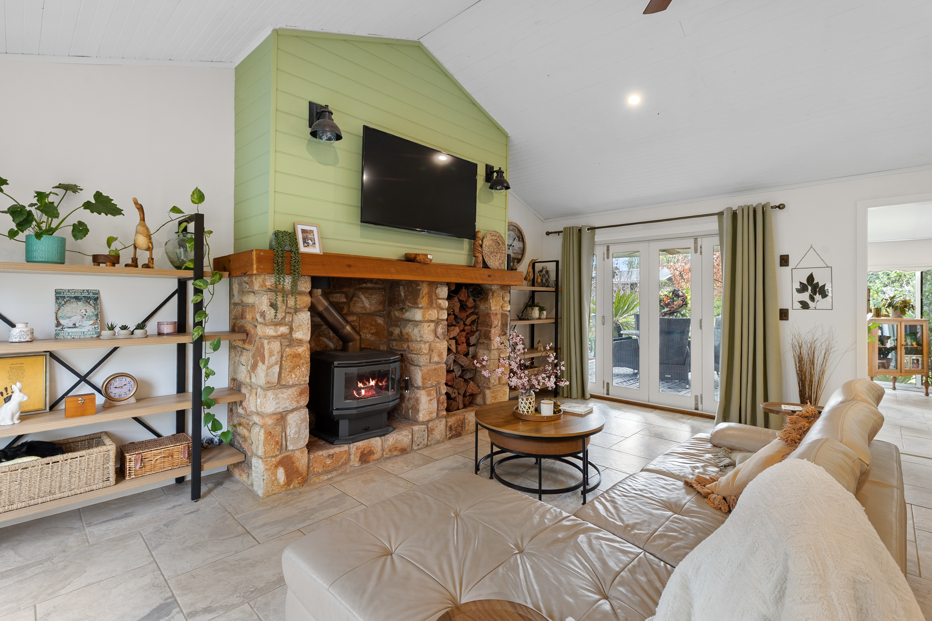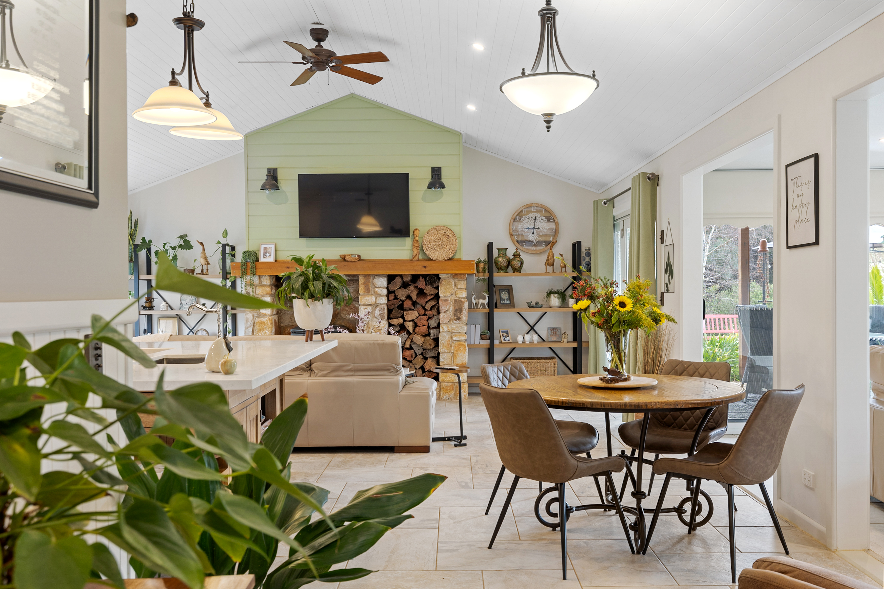 Step into warmth and charm with an open-plan country kitchen featuring a stone island bench, large gas cooktop, and walk-in pantry/butlers. The adjoining dining and family room boasts a stunning stone feature fireplace, soaring timber-lined cathedral ceilings, and French doors that open to the under-roof outdoor entertaining area.