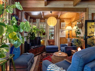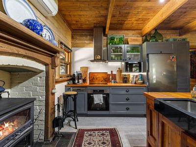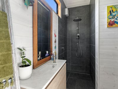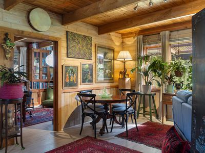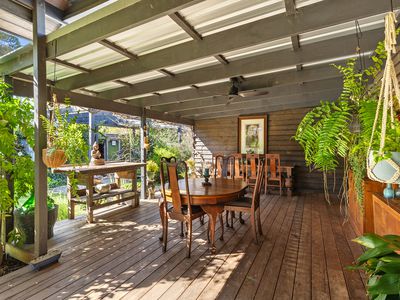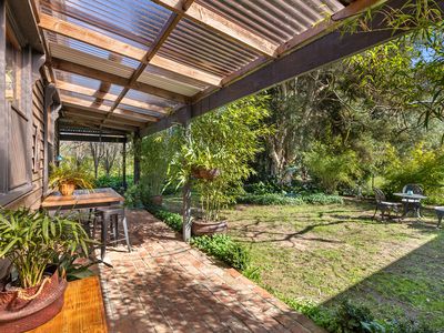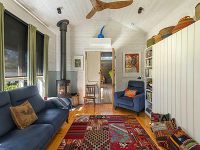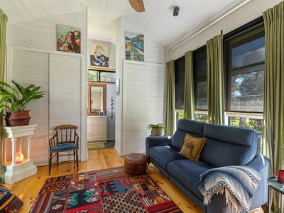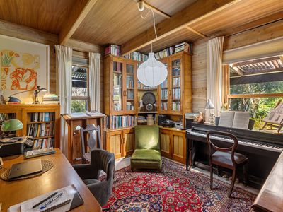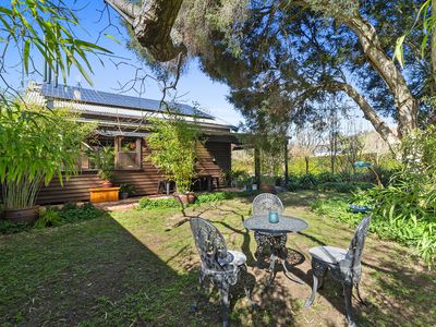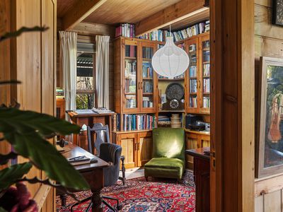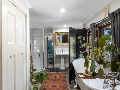 Step outside to the expansive, cathedral-roofed entertaining deck — the perfect setting for outdoor dining and relaxation. Flowing from this space is a fully self-contained one-bedroom studio with ensuite, split system heating/cooling, and a Morso wood heater. Ideal as a guest retreat, home office, creative studio, or luxurious third bedroom.