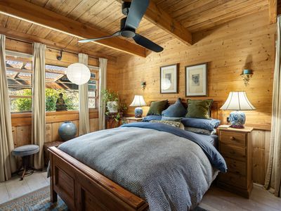 * Spacious master bedroom with built-in robes, ceiling fan, and full timber lining