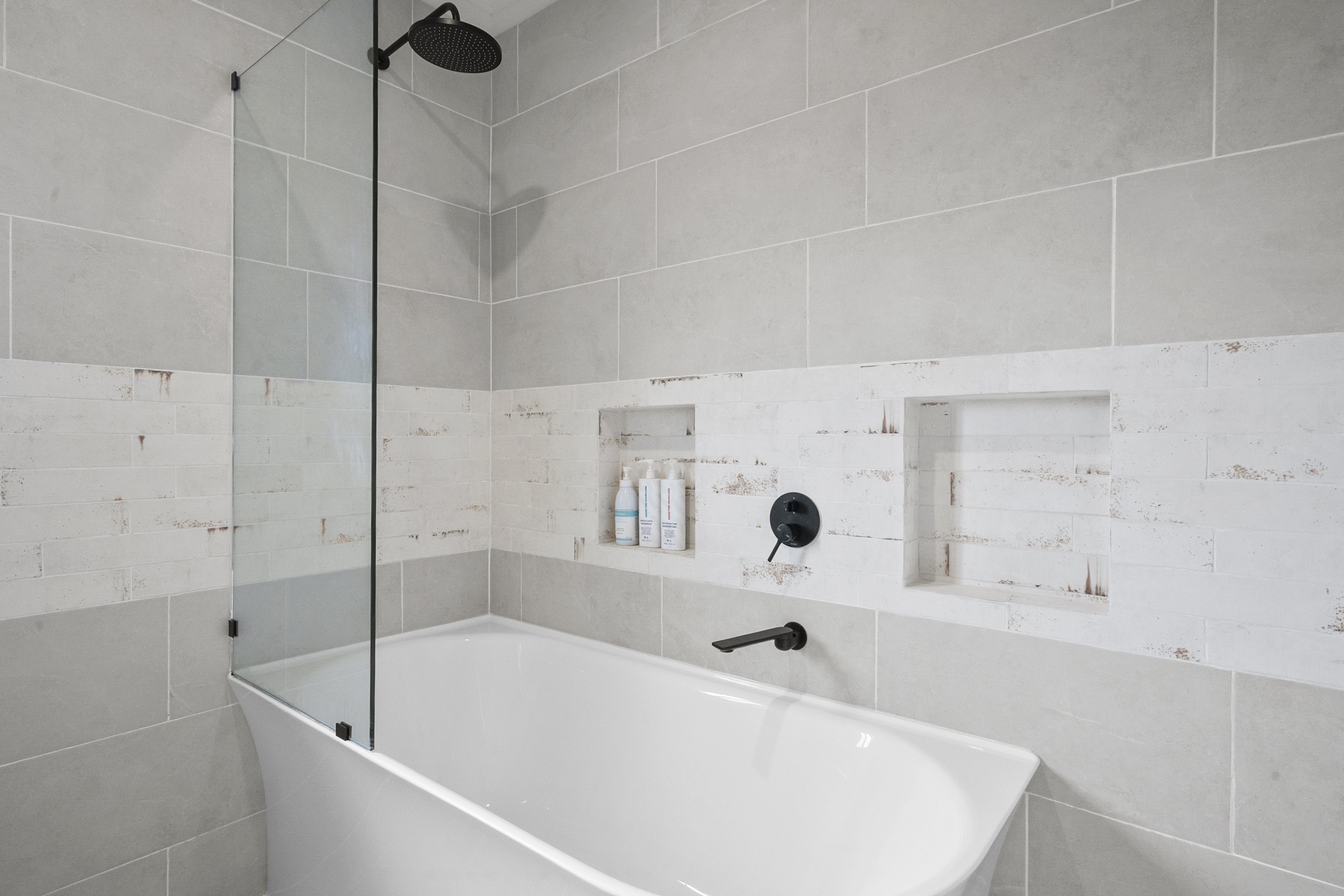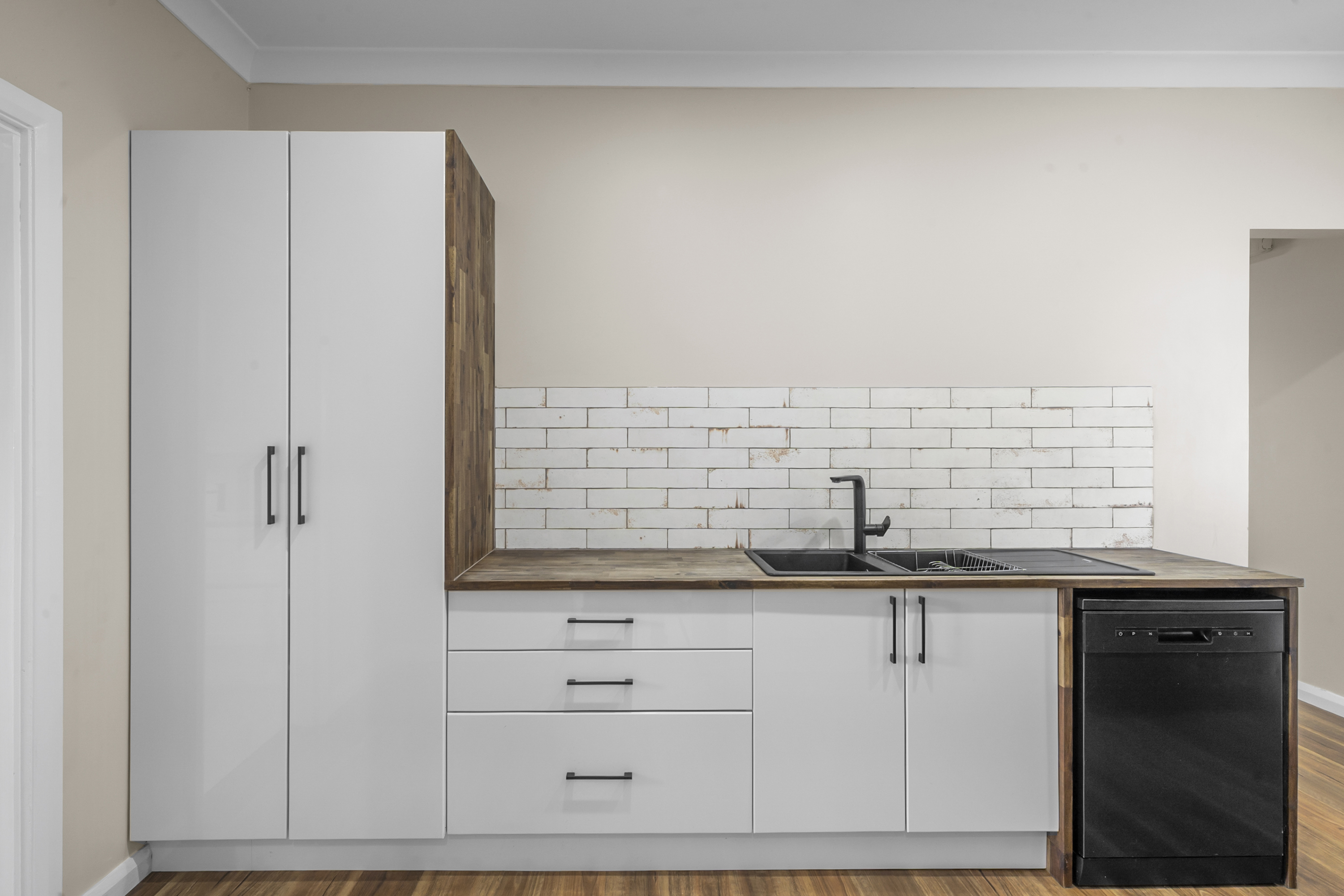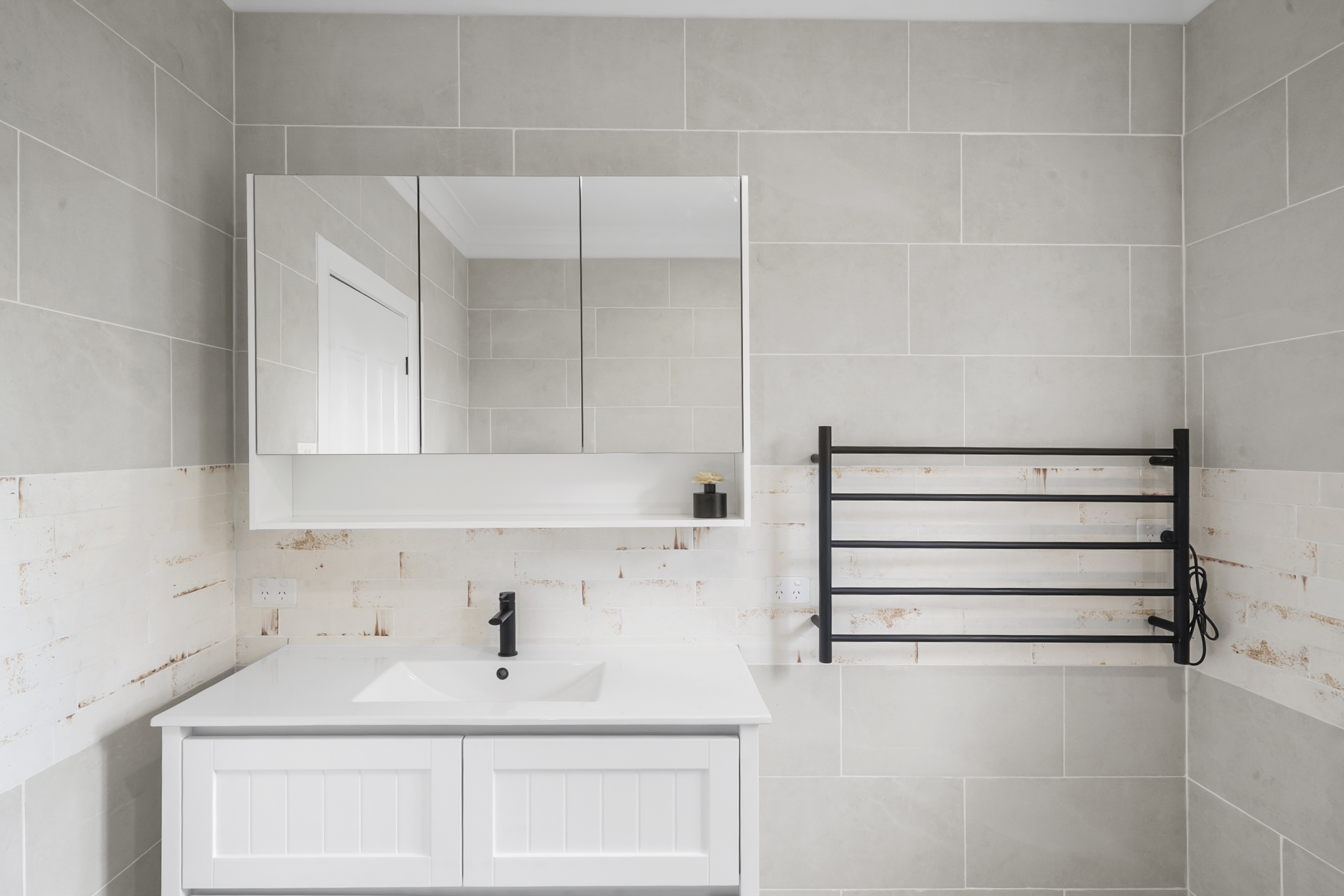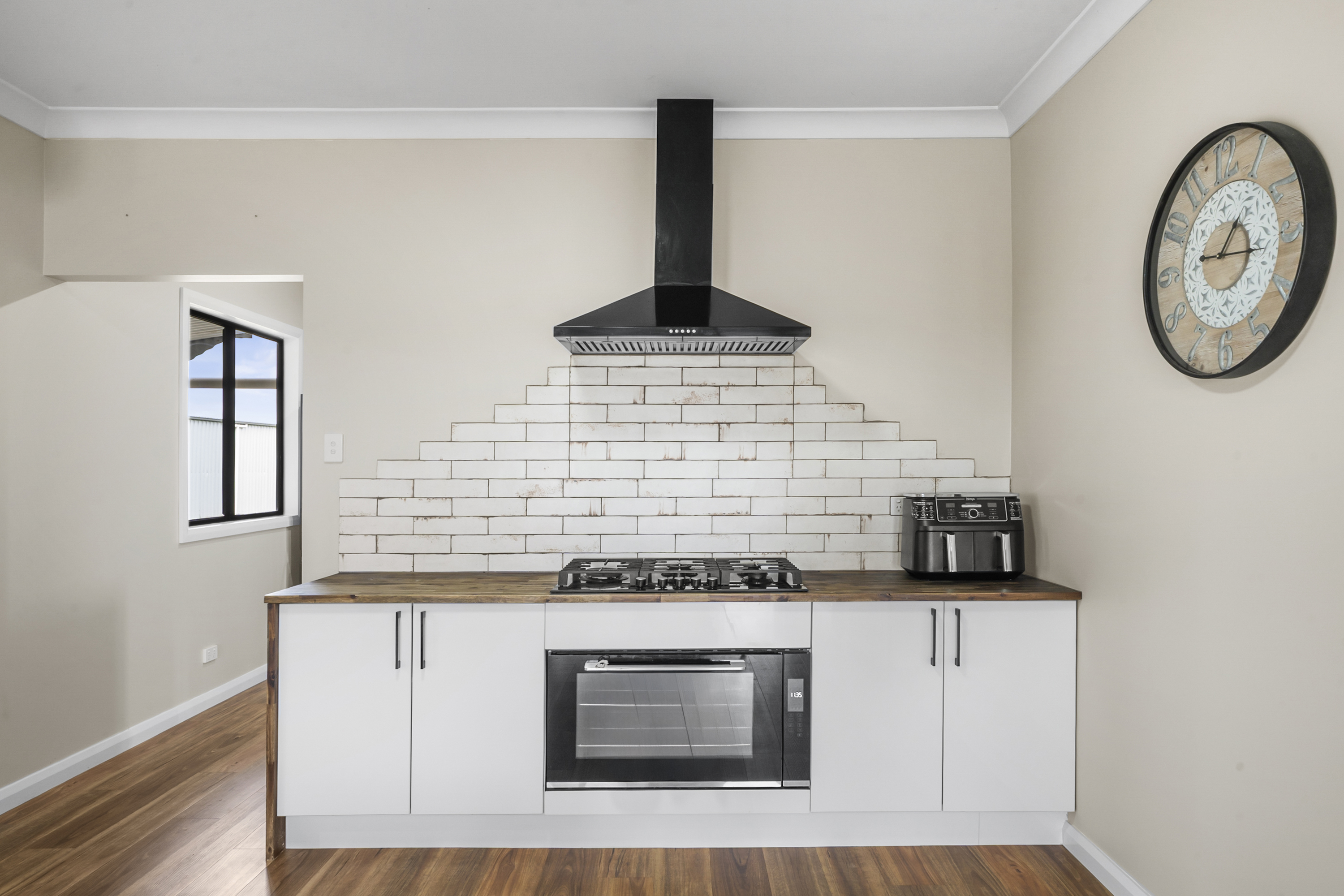 • Stunning rust-look feature tiles and timber floorboards throughout