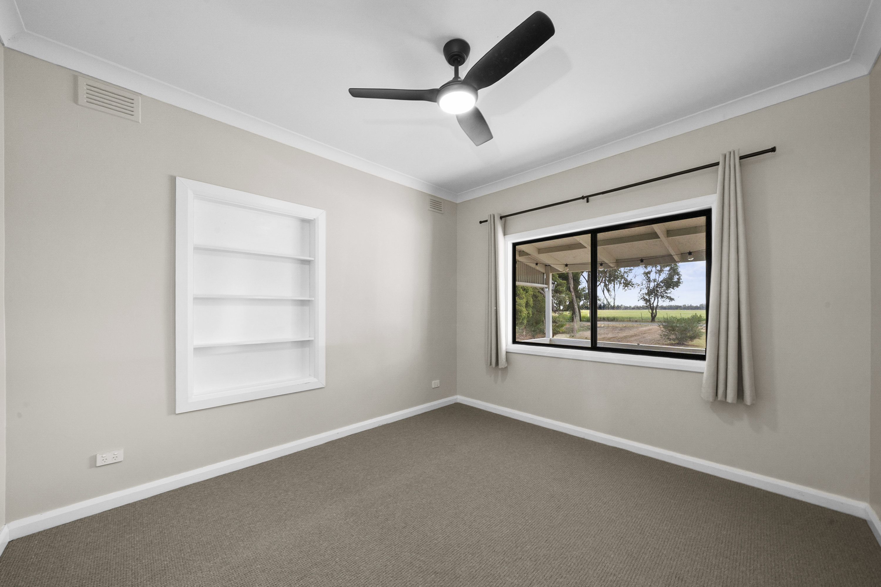 • Bedroom 1: Carpet, fan, built-in shelving, great natural light