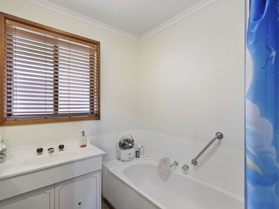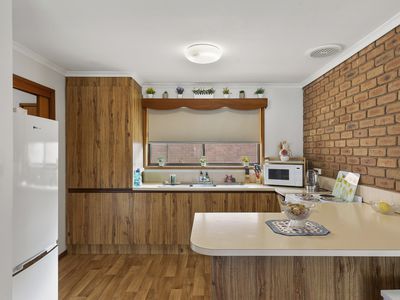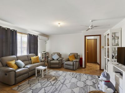 Neat and tidy throughout, the home features a spacious lounge with split system heating and cooling and attractive laminate timber flooring that flows through the main areas. A separate dining space adjoins the functional kitchen, which offers plenty of storage and potential to update in your own time.