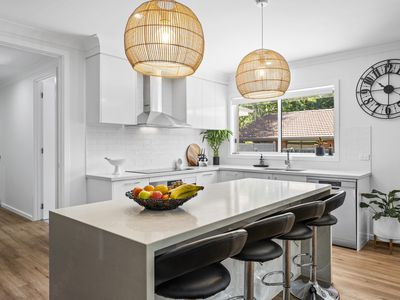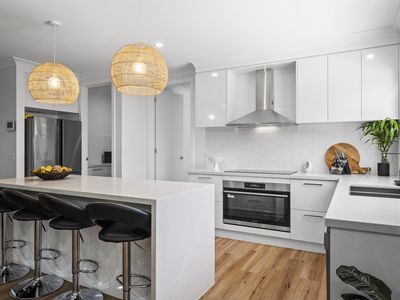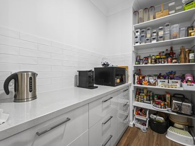 Showcasing a 40mm stone waterfall island bench, walk-in pantry, and 90cm induction cooktop and oven.