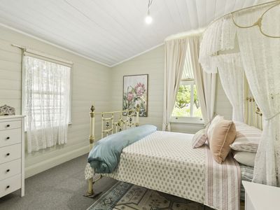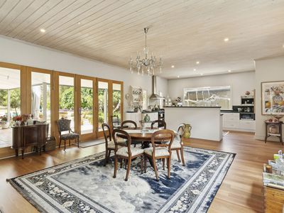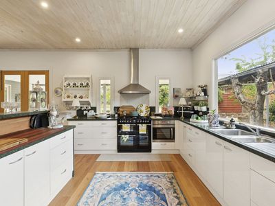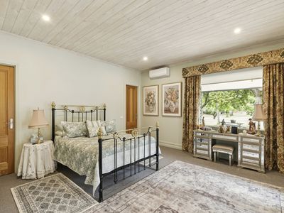 Two generous living zones, finished with new engineered timber flooring, create an inviting atmosphere for relaxed rural living. The bright, modern kitchen is an entertainer’s dream, complete with a gas hob, freestanding electric oven, large butler’s pantry, and a walk-in cool room. Glass doors open from the lounge and dining area to the lush gardens and an undercover alfresco space, ideal for year-round enjoyment.