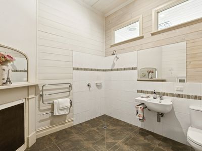Originally built in the 1870s and recently repainted, the home features approximately 240 sqm of beautifully refreshed living space. Offering four bedrooms—including a spacious main with a newly renovated ensuite—three bathrooms, and a powder room, the home has been newly carpeted throughout the bedroom areas. Soaring 10-foot ceilings further enhance the sense of light and space.