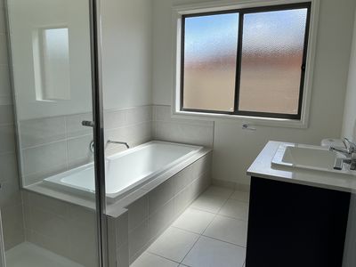 * Central bathroom with bath, separate shower, single vanity, and toilet