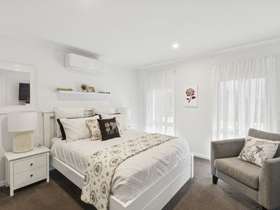 The master bedroom features a walk-in robe, ensuite, and split-system heating and cooling, while the second bedroom includes built-in robes. Stylish contemporary bathrooms, a spacious laundry, and a walk-in linen cupboard add to the home’s thoughtful design.