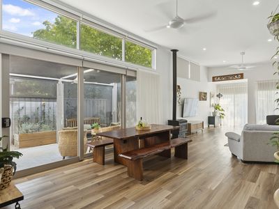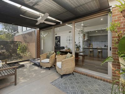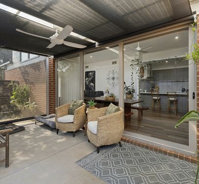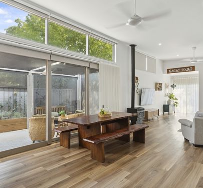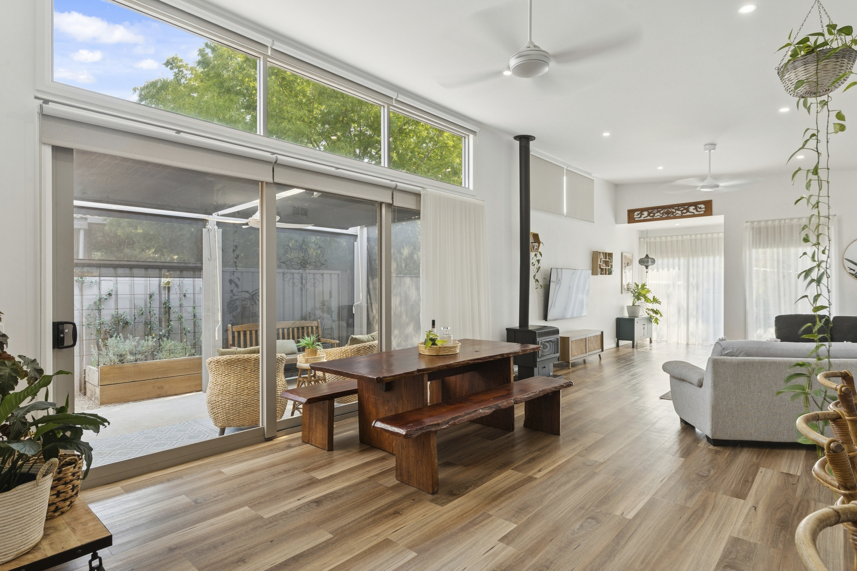 Large glass double doors extend the living space outdoors to a covered alfresco area, complete with privacy blinds for year-round comfort and entertaining.