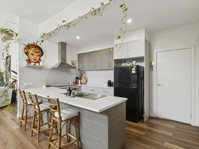 The heart of the home is the expansive open-plan kitchen, dining, and living area, where soaring ceilings, floor-to-ceiling windows, and a warm gas fireplace create a sense of space and comfort rarely found in a home of this style. The contemporary kitchen is both stylish and functional, offering a built-in pantry, electric cooktop and oven, and dishwasher—ideal for everyday living and entertaining alike.