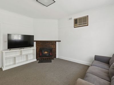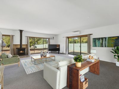 The home features a huge, light-filled main living area complete with wood fire and air conditioning, complemented by a second front lounge also warmed by a wood fire — perfect for flexible family living or multiple living zones. A spacious dining area connects seamlessly to the main living space, enhancing everyday functionality and entertaining ease.