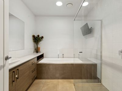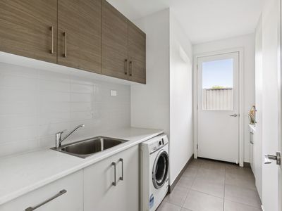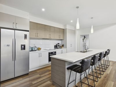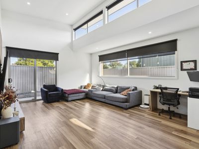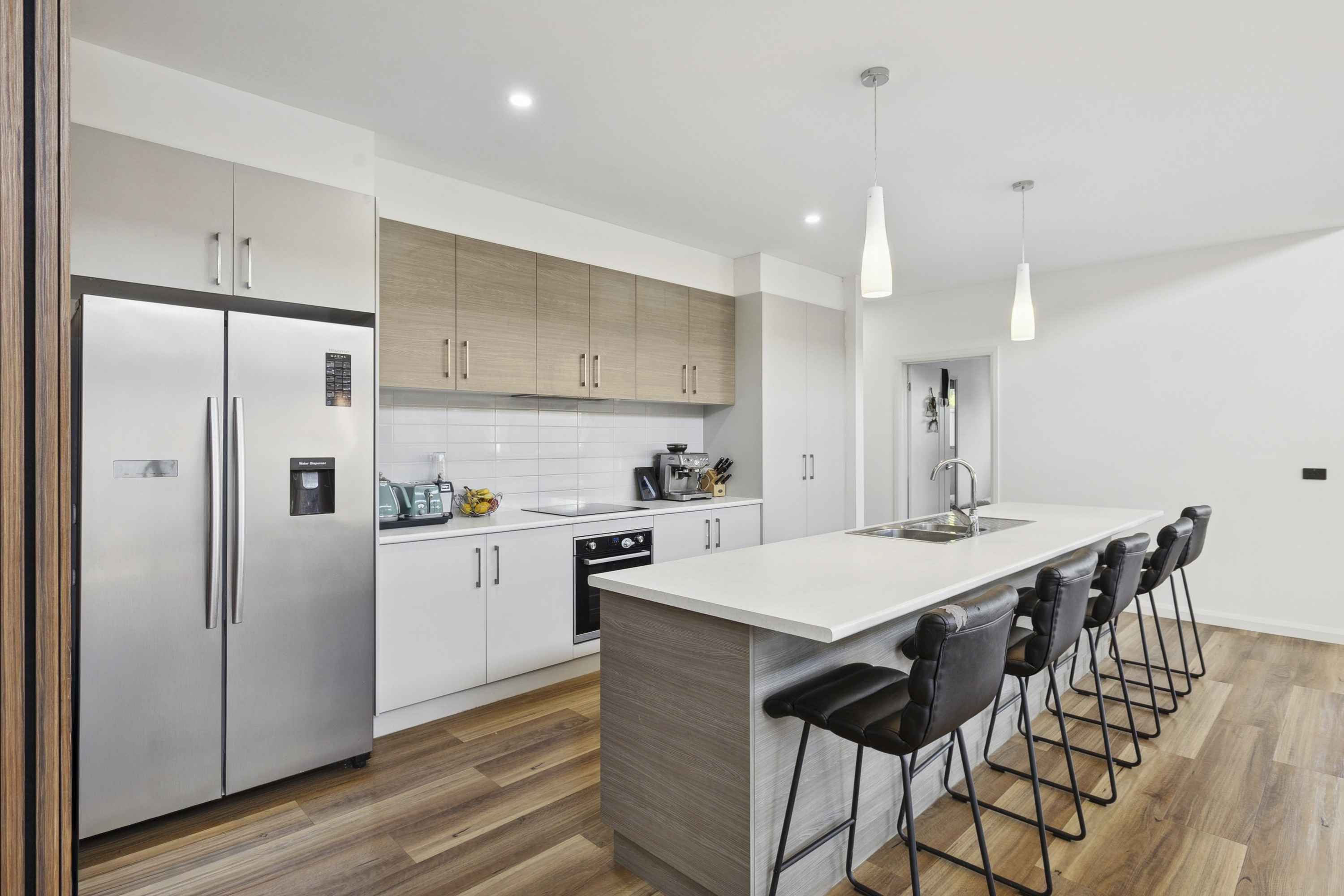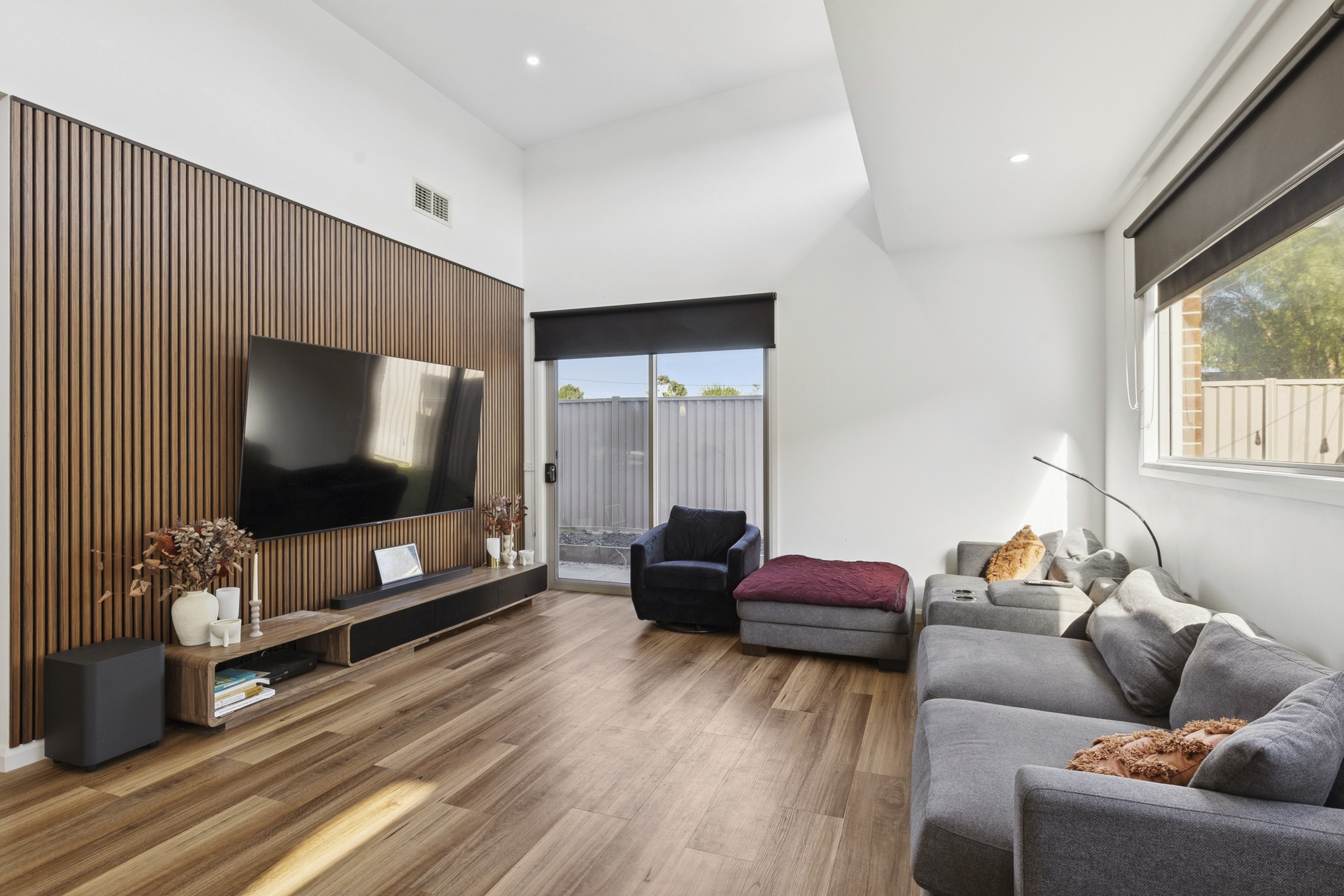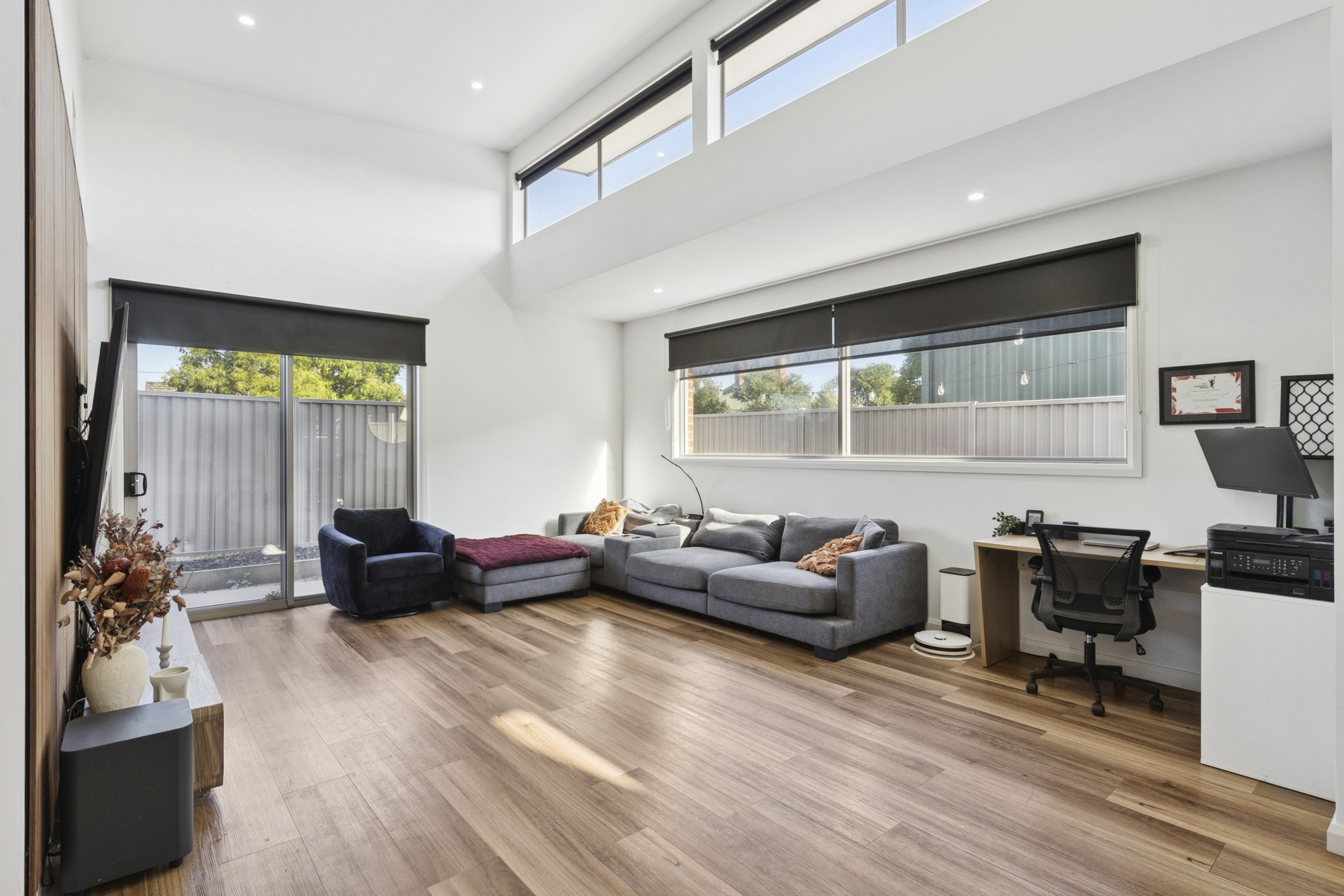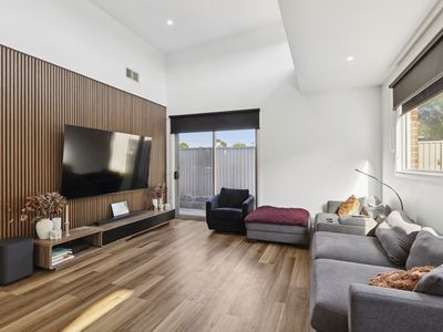 Behind its sleek, low-maintenance façade, the home opens to a light-filled and generously proportioned interior. The welcoming front entry immediately sets the tone, showcasing a stunning timber feature wall and stylish foyer space.