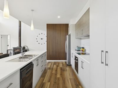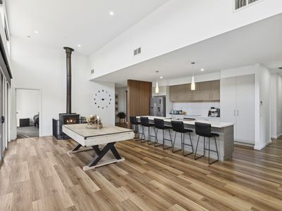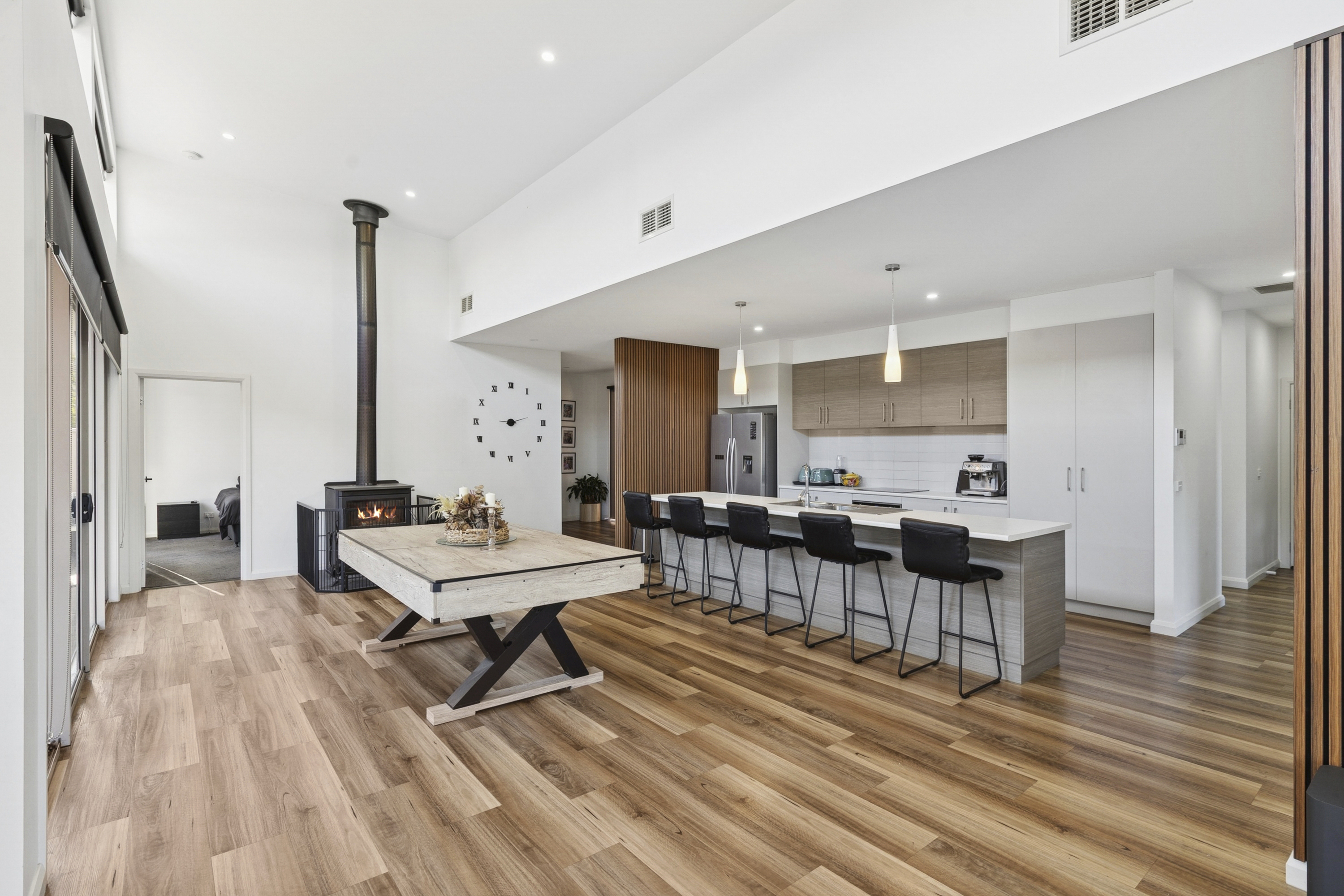 At the heart of the home lies the impressive open-plan kitchen, dining and living zone. Soaring ceilings, floor-to-ceiling windows and a warm wood fireplace create an inviting sense of space and comfort rarely found in a home of this style. The contemporary kitchen is both functional and elegant, featuring ample bench space and storage, electric cooktop and oven, dishwasher, and excellent preparation areas—ideal for everyday living and effortless entertaining. The spacious lounge also showcases a striking timber feature wall and provides plenty of room for relaxed family living.