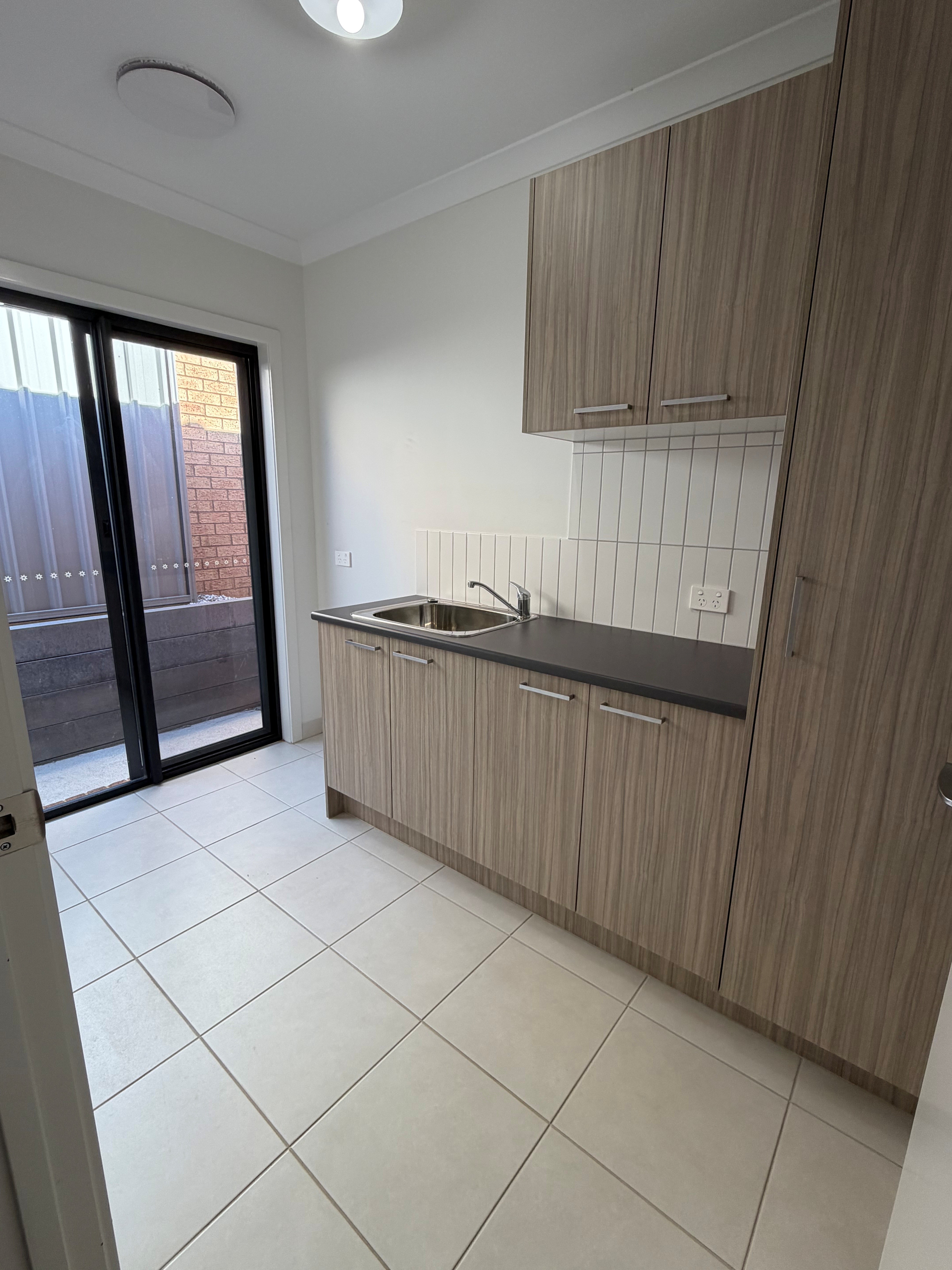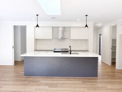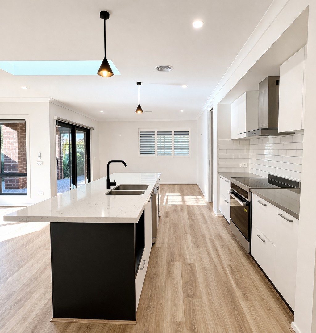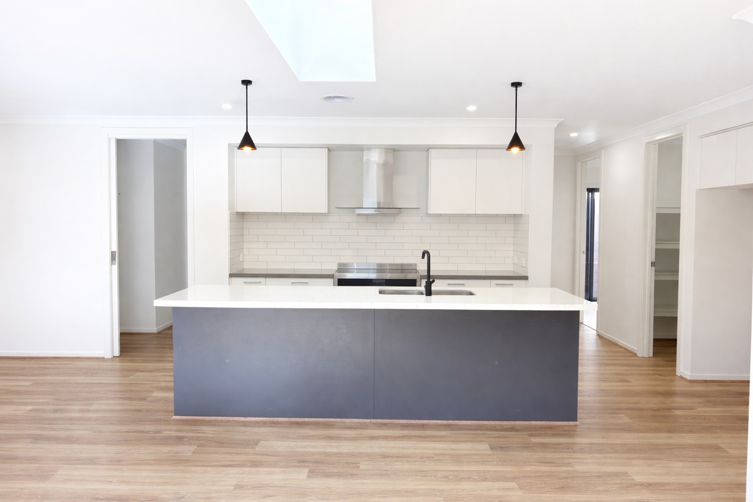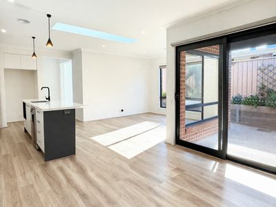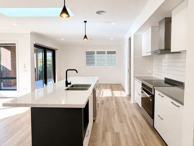 At the heart of the home is the light-filled open plan living, dining, and kitchen area, enhanced by a skylight that floods the space with natural light. The modern kitchen is thoughtfully appointed with a walk-in pantry, double sink, large island bench, electric cooktop and oven, and a dishwasher.