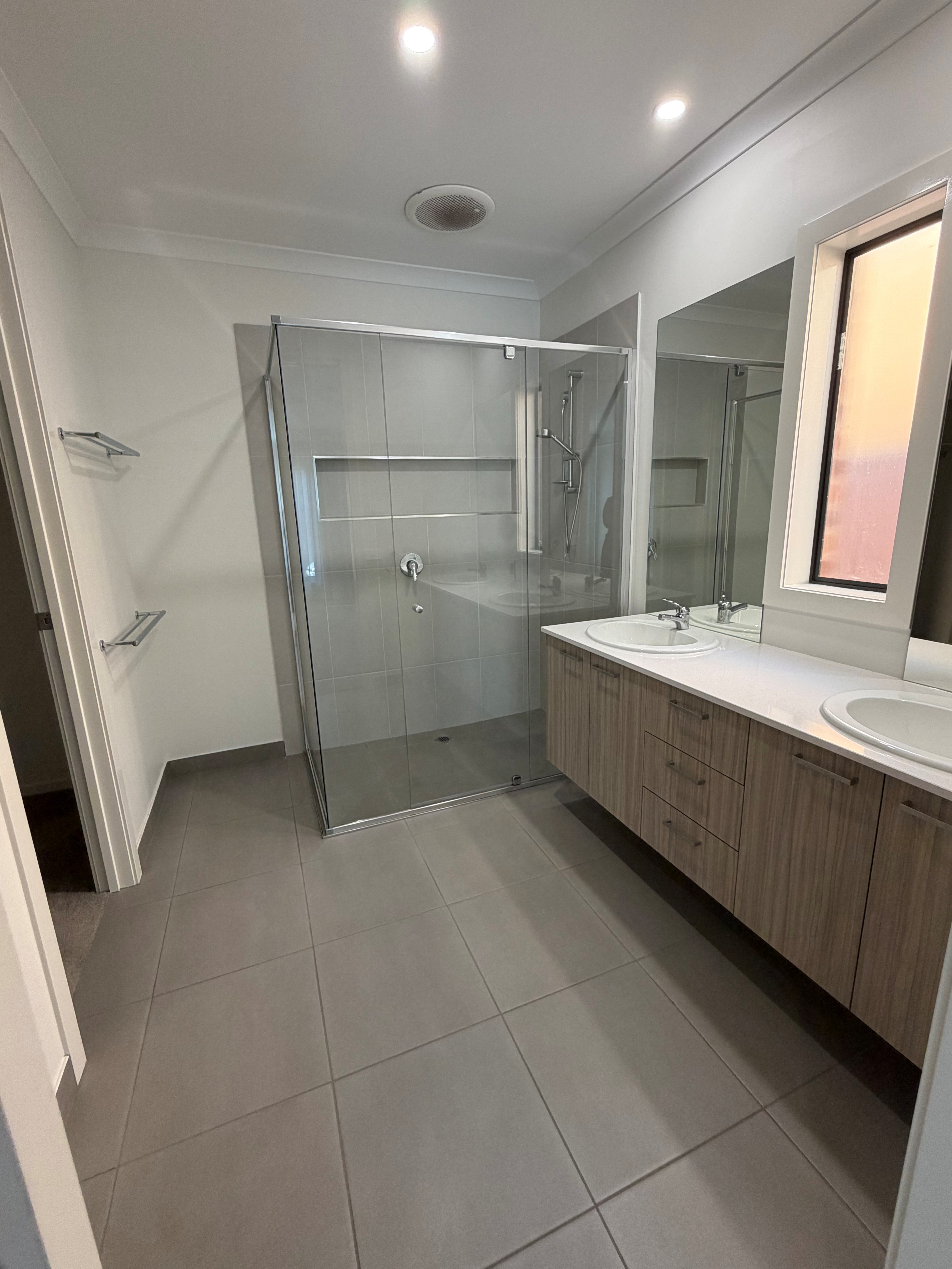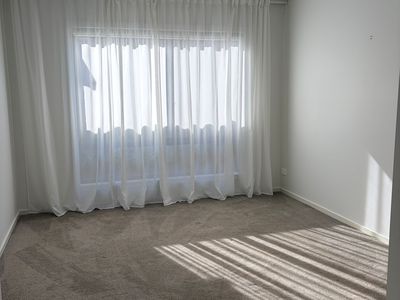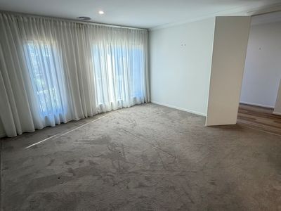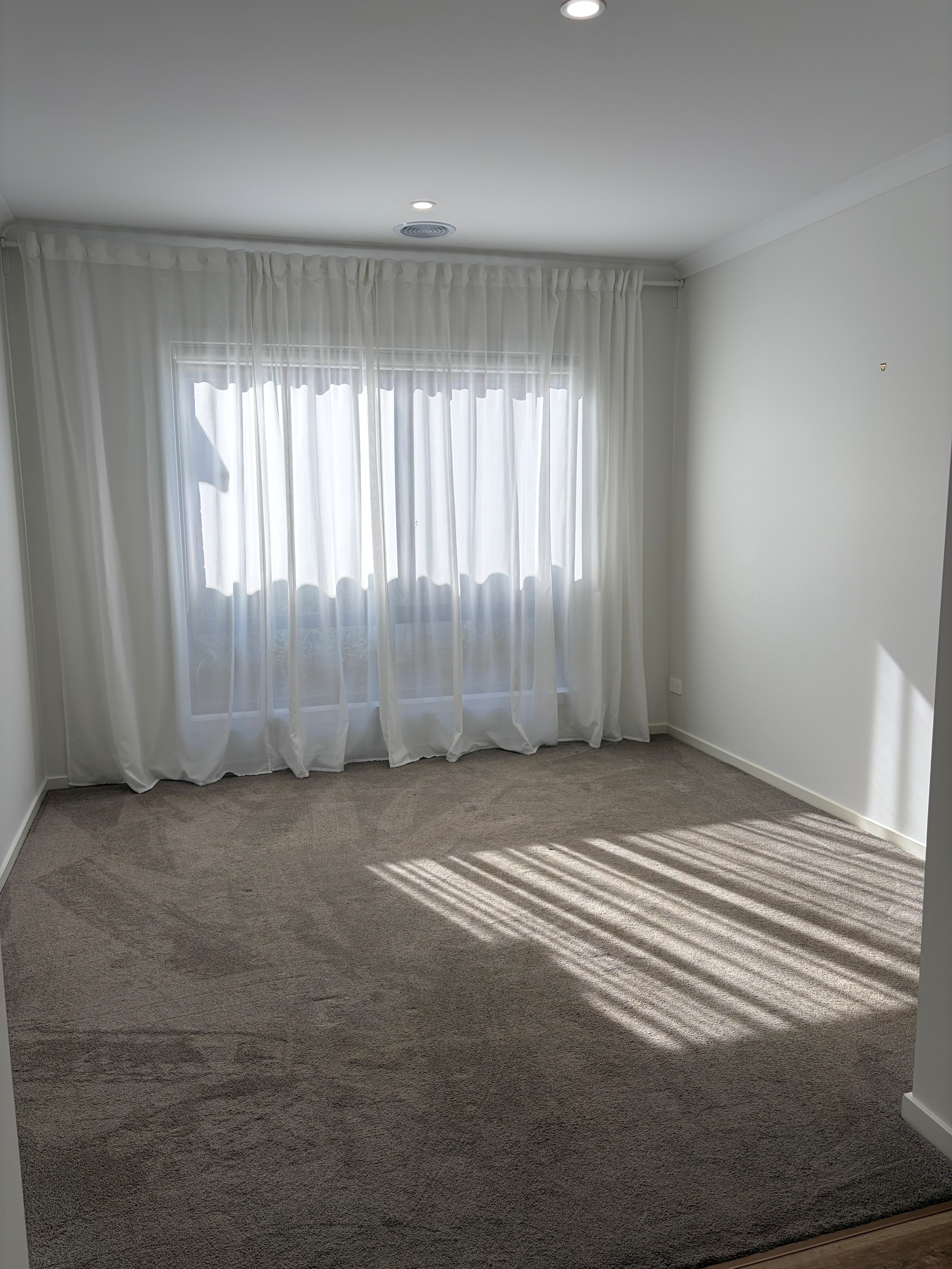 Boasting high ceilings throughout, the home offers a sense of space and light from the moment you enter. The expansive master bedroom is a true retreat, featuring plush carpeting, elegant floor-to-ceiling sheer curtains with additional block-out blinds, and double doors. It is complemented by a luxurious ensuite complete with a large shower, double vanity, separate toilet, and a generous walk-in robe.