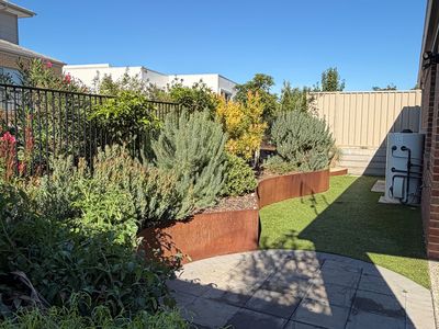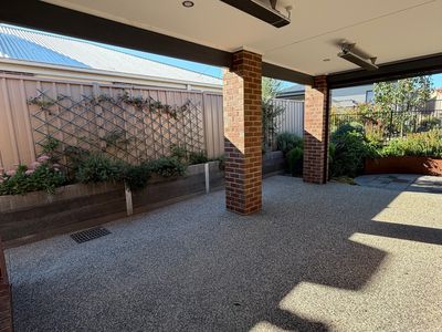 Seamless indoor-outdoor living is achieved with glass sliding doors from the dining area opening directly onto the outdoor entertainment space. This area is equipped with heaters and outdoor blinds, ensuring year-round comfort and privacy. The rear yard is designed for easy care, featuring low-maintenance gardens and astro turf, along with a rear gate providing direct access to a walking path.