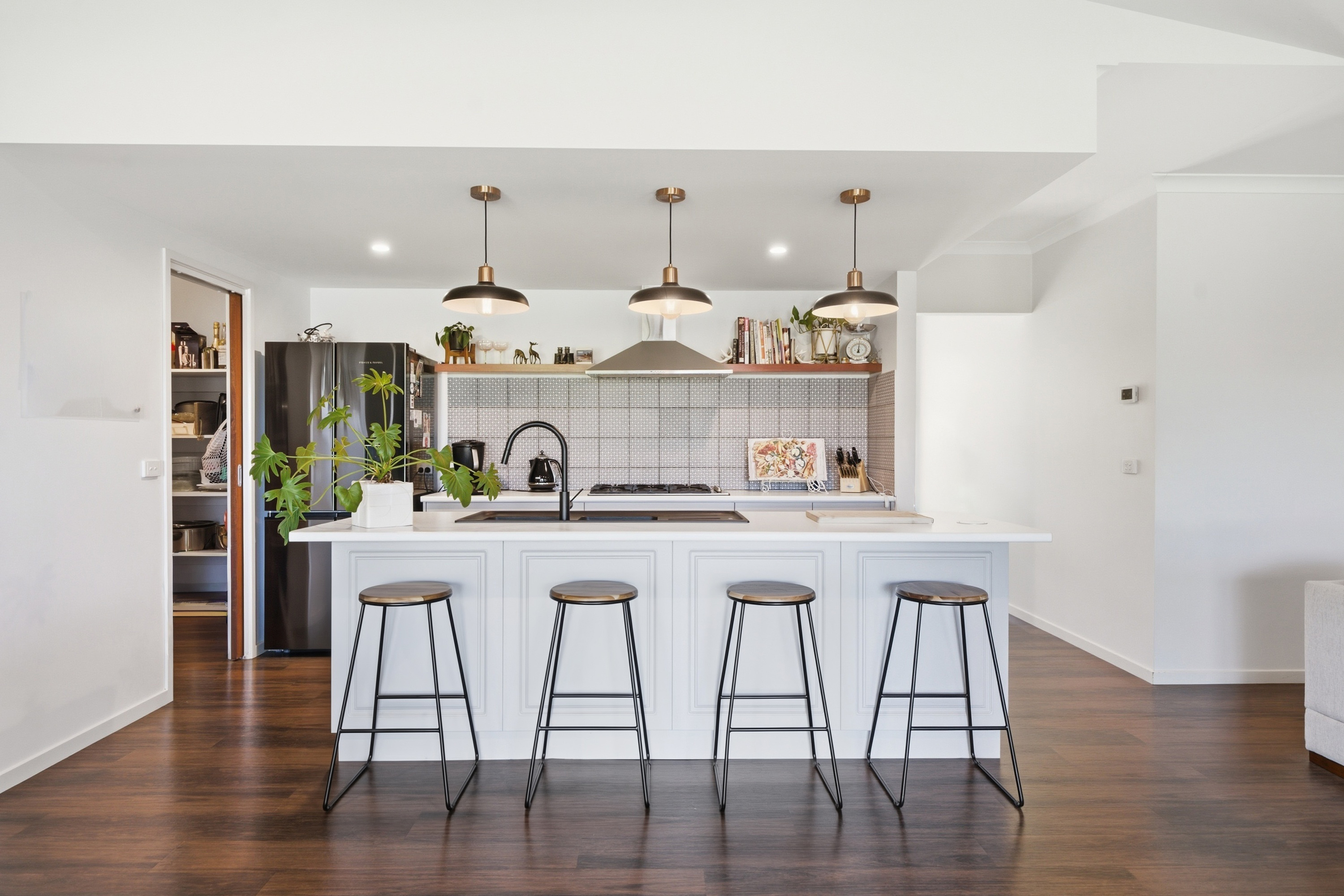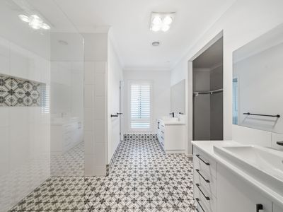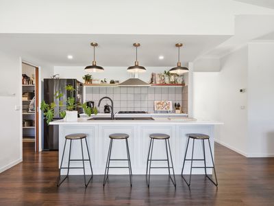 The home boasts four generous bedrooms, including a master suite with private ensuite, along with two separate living areas providing plenty of room for both relaxation and entertaining. The well-appointed kitchen is designed for practicality and style, featuring a walk-in pantry, dishwasher, gas cooktop, electric oven, and ample storage.