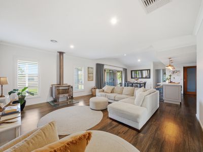 The main living area is warm and inviting with a wood fireplace, while ducted heating and cooling throughout the home ensures year-round comfort.