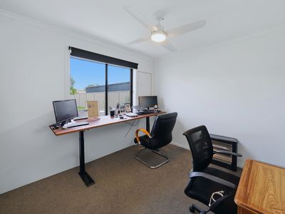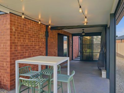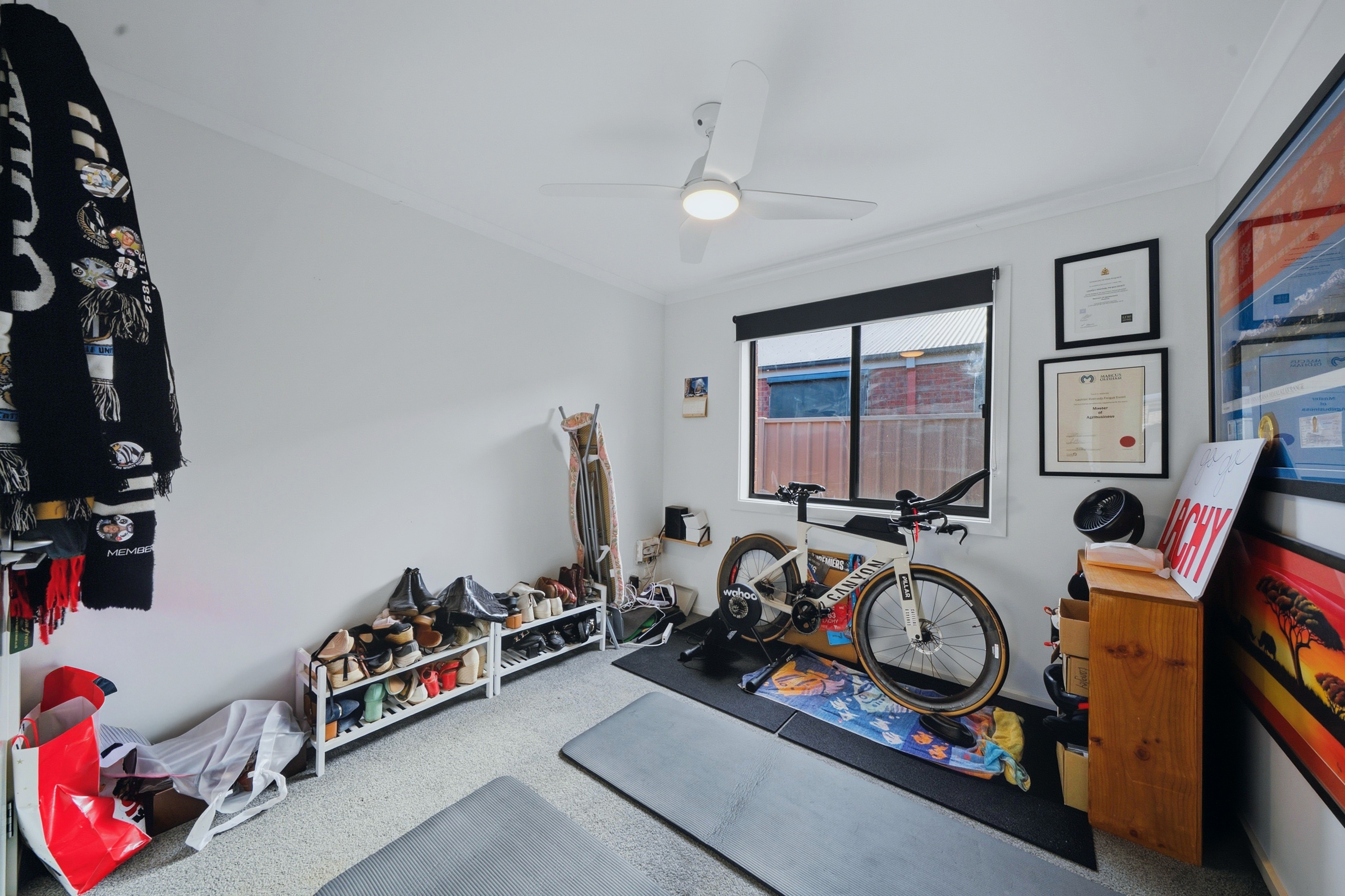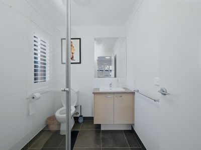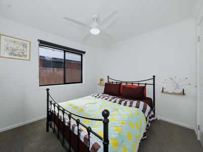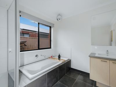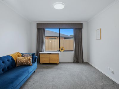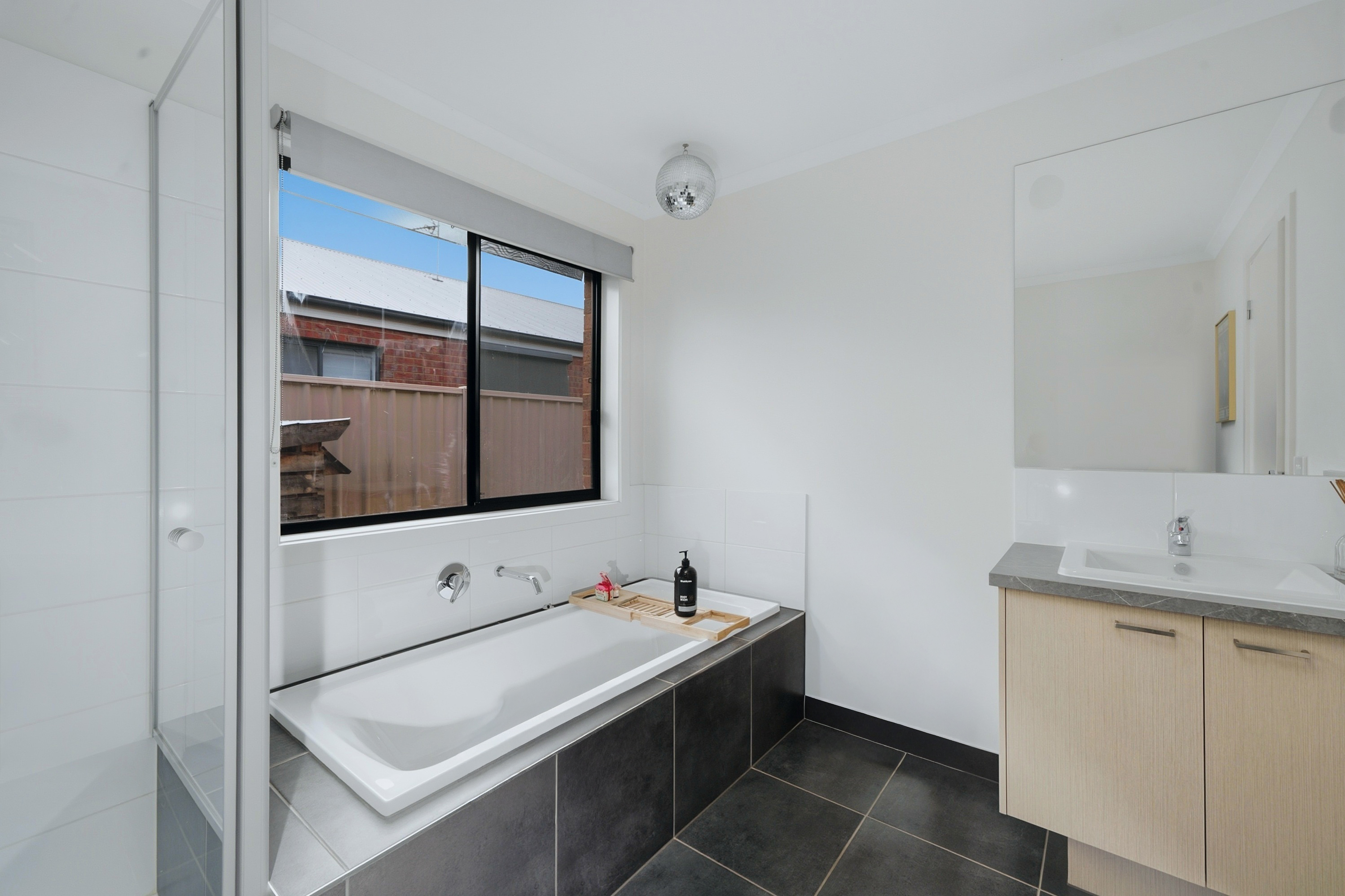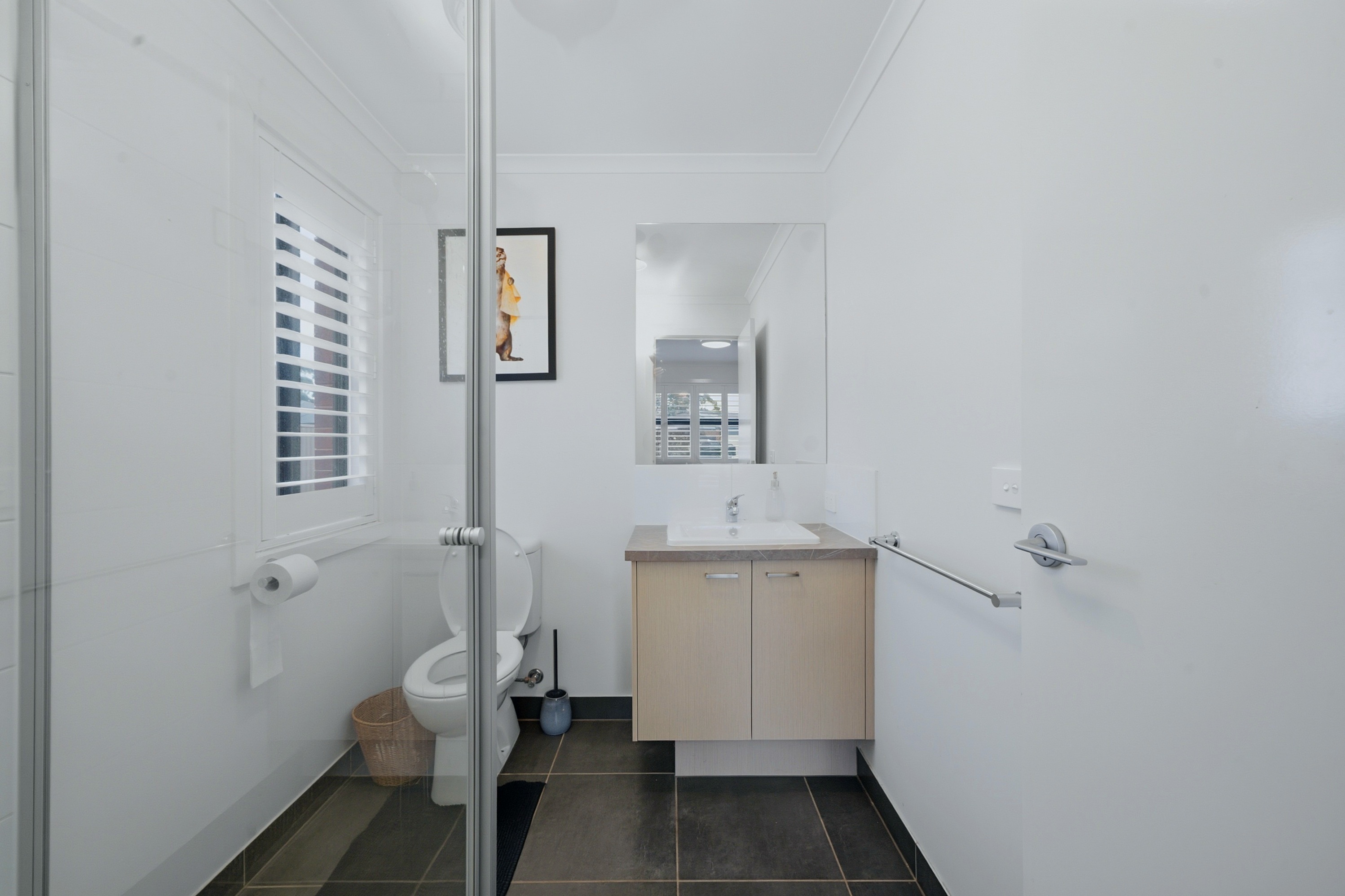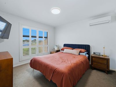 The spacious master bedroom is thoughtfully designed with split system heating and cooling, an upgraded walk-in robe, plush carpeting, and elegant plantation shutter blinds. The private ensuite includes a shower, toilet, and single vanity.