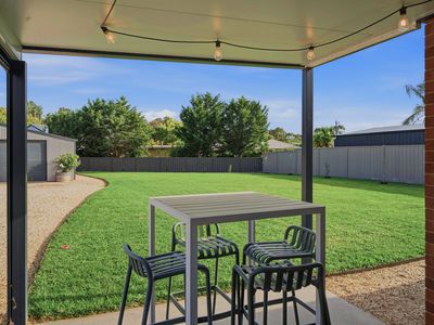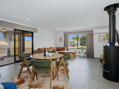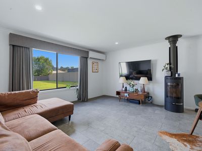 The main living area is warm and inviting with a wood fireplace, complemented by split system heating and cooling for year-round comfort. Large glass sliding doors open directly onto a built in outdoor entertaining area, seamlessly connecting indoor and outdoor living.