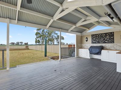 A beautiful big entertainers deck with outdoor kitchen takes in the massive sprawling lawn with rural views to the rear.