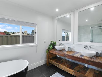 A modern bathroom design with free-standing bath, separate laundry and toilet.