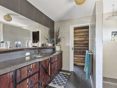 * Stylish main bathroom with custom timber cabinetry & concrete tops, walk-in shower & separate toilet