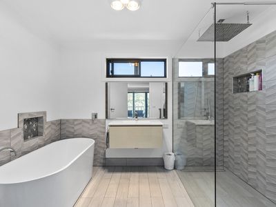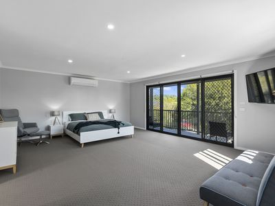 Upstairs we are welcomed into a large master suite with sitting area, private balcony, walk in robe and stunning ensuite with freestanding bath and walk-in shower, the perfect place to escape from the kids.